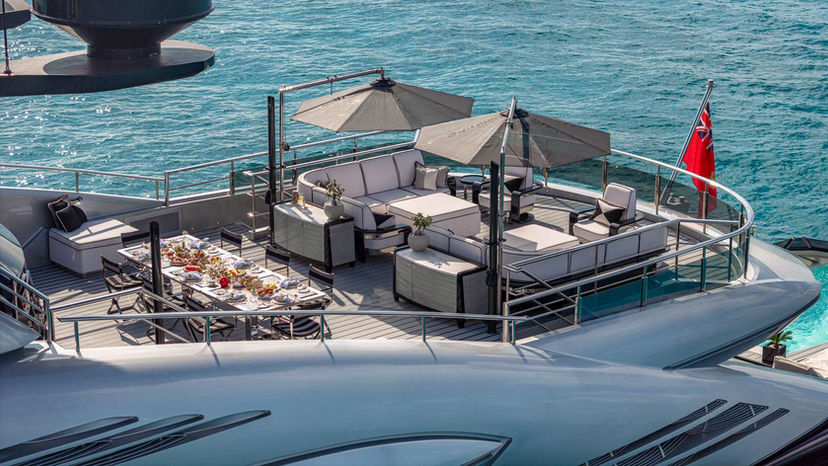 This sophisticated superyacht features a 6-meter infinity-edge swimming pool with a contraflow system, surrounded by comfortable loungers that create the ambiance of an exclusive beach club. The pool flows seamlessly into the main salon through large retractable floor-to-ceiling glass doors, where a circular dining table for 12 guests offers breathtaking views.